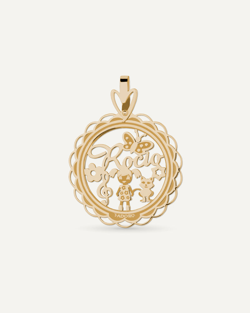 Colgante exclusive en 25mm de oro en 18KT o 9KT personalizado con nombres.